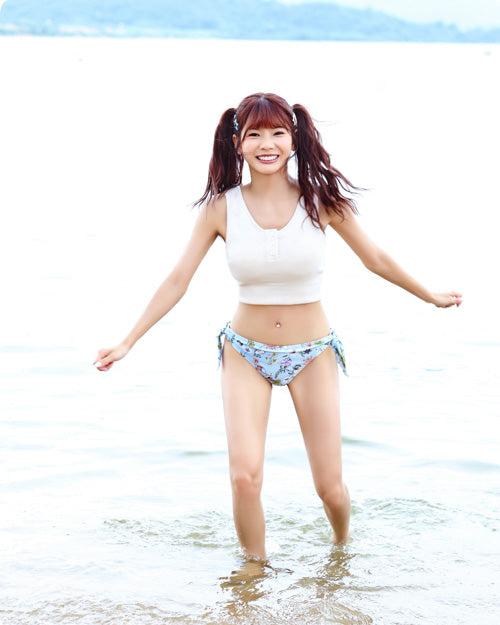 「每一次穿上這套Kawaii Collection,我都能感受到一種全新的自己。」芮絲分享道。作為統一獅啦啦隊的明星成員,她習慣了在球場上展現活力四射的一面,但這套日系泳衣讓她發現了另一種美的可能性。米白色針織質感上衣配上淺藍碎花綁帶下裝,整體造型既保持了運動女孩的健康活力,又增添了溫柔優雅的日系風情。