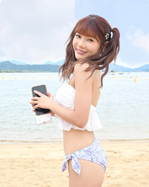 當芮絲雙手舉起手機,那個瞬間的笑容彷彿定格了整個夏天的美好。身穿NAMI Kawaii Collection白色蕾絲綁帶比基尼,搭配夢幻淡紫印花下身,這不只是一套泳衣,更是一種生活態度的展現——在最平凡的日常裡,發現最珍貴的快樂時光。