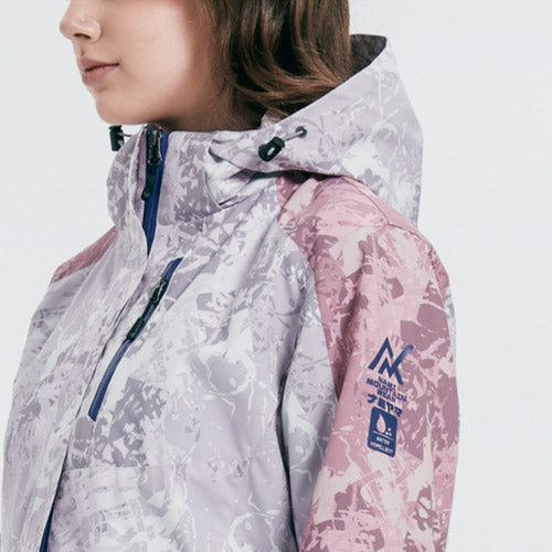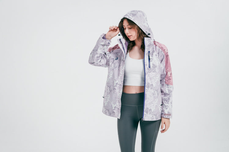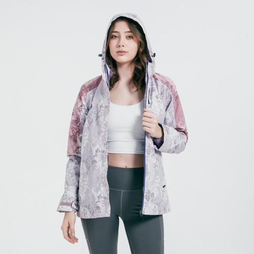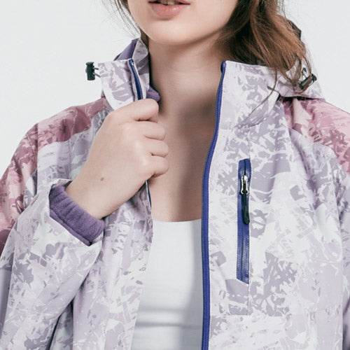 NAMI粉紫迷彩印花二合一外套,採用品牌專屬設計印花,柔美又獨特。外層防風防水,內層抓毛保暖,完美應對寒冷天氣。左胸拉鍊側袋方便實用,可拆式後帽增添造型變化。適合滑雪、極地旅行等戶外活動,配搭運動褲展現動感魅力。