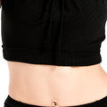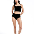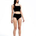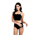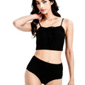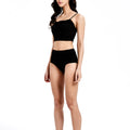 一位女士站在白色背景上,身穿棕色兩件式泳衣,下身是高腰設計,上身是前領帶設計的剪裁上衣。她留著深色的長髮,一隻手臂彎曲,手放在頭上。. 一個穿黑色上衣的女人.
