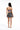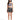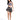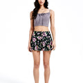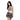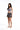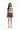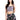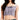 一位女士站在白色背景上,身穿棕色兩件式泳衣,下身是高腰設計,上身是前領帶設計的剪裁上衣。她留著深色的長髮,一隻手臂彎曲,手放在頭上。. 一個穿黑色上衣的女人.