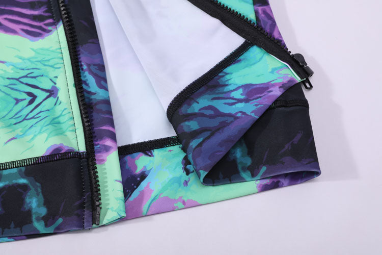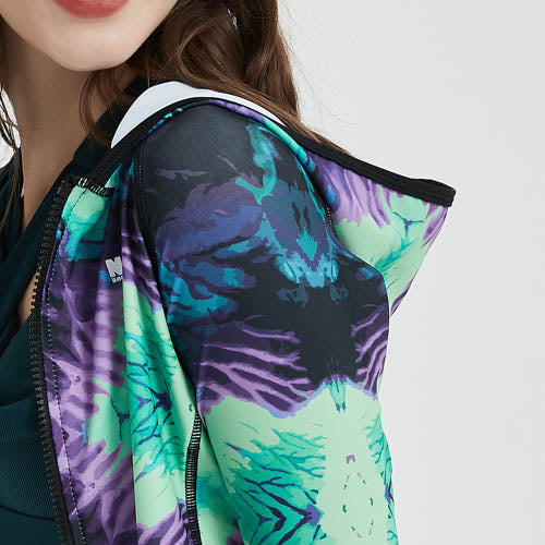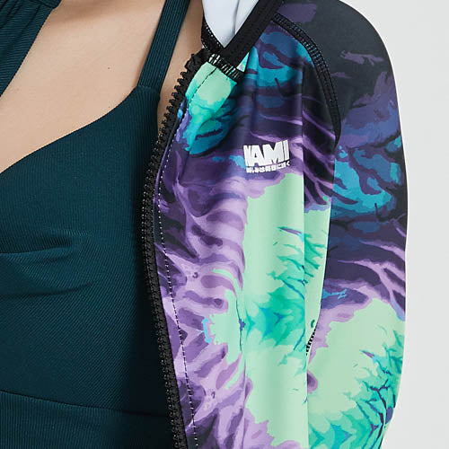 這款NAMI PRO炫彩幻影拉鍊連帽防曬衣,為水上活動愛好者帶來獨特視覺體驗。採用黑色基調,融合紫色與亮綠色的幻彩圖案,仿若夜空中舞動的極光,極具視覺衝擊力。