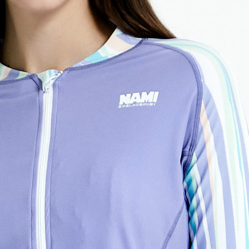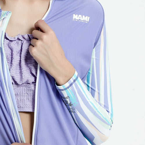 這款NAMI PRO薰衣草條紋拉鍊防曬衣以柔和的薰衣草紫色為主體,袖子採用彩色條紋設計,清新雅致。背部「OCEAN BEACH」字樣彰顯衝浪文化。企領設計全面保護頸部,牛角袖結構增加活動靈活度,讓你在划槳、滑浪、浮潛等水上活動中動作自如。採用UPF50+防曬布料,有效阻隔紫外線傷害。拉鍊開合設計讓穿脫變得輕鬆簡便,輕薄透氣的面料貼合身形不束縛,為夏日水上活動提供舒適防護體驗。