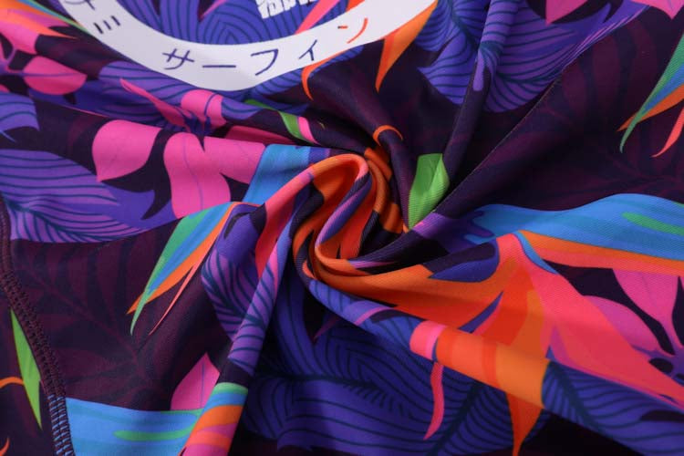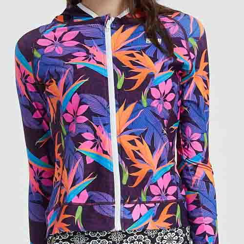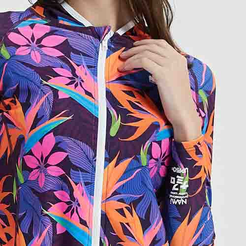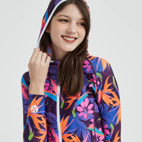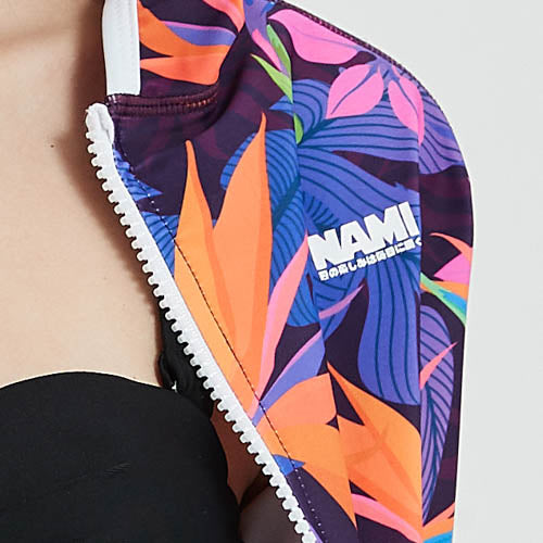 這款NAMI PRO熱帶繽紛拉鍊連帽防曬衣,將熱帶風情完美融入水上運動裝備中。紫色基調搭配鮮豔的橙色、藍色熱帶葉片圖案,色彩飽和度高,充滿活力與朝氣,讓你在水上活動中成為焦點。