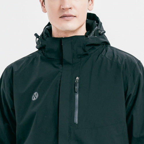 NAMI純黑色男裝二合一外套,簡約時尚的設計,百搭實用。外層採用防風防水物料,內層抓毛衣保暖舒適。左胸拉鍊側袋方便實用,可拆式後帽增添造型變化。經典黑色適合各種場合,無論是滑雪、極地旅行還是都市穿搭都能完美駕馭。建議搭配深色長褲,打造沉穩型格造型。