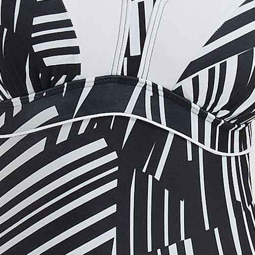 這款黑白幾何條紋連身泳衣展現出現代都會感,前胸採用優雅V領設計,搭配白色滾邊點綴,營造層次感。獨特的直條紋與切割線條圖案不僅時尚,更能達到視覺修身效果。特製的臀部包覆設計與人魚線立體剪裁,讓你在泳池中舒適自在又不失時尚。