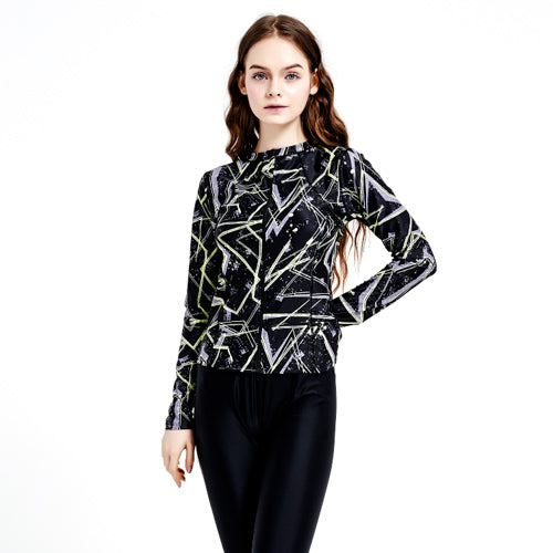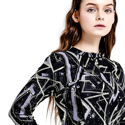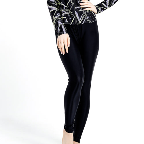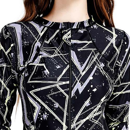 紫色閃電幾何圖案四件套泳衣,充滿動感活力的設計。運動內衣和短褲採用包覆性強的面料,確保運動時的支撐度。配搭黑色長褲,打造運動時尚造型,一套滿足泳池、健身房多種場合需求。