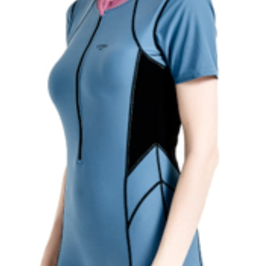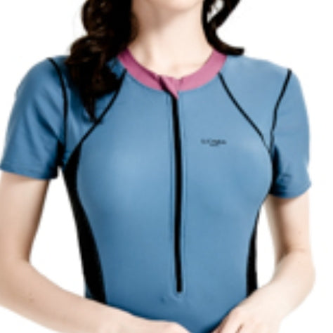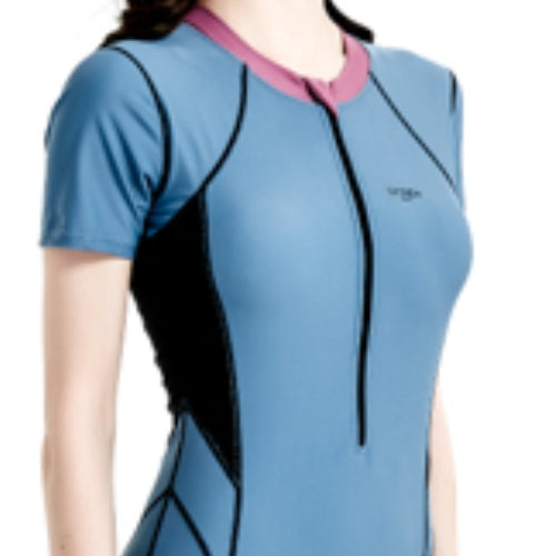 清新藍色練習泳衣,配搭粉色領口設計,展現活力氣質。前中拉鍊設計使更衣更便捷,特別適合親子游泳課程使用。側邊黑色拼接修身顯瘦,讓穿著者在泳池邊更添自信。獨特人字車線確保長期使用依然保持挺括。