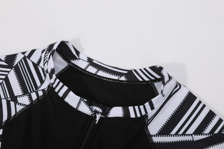這款黑白幾何印花分體泳衣完美結合時尚與實用性。主體採用經典黑色設計,搭配獨特的白色幾何圖案,營造出現代感十足的視覺效果。前中拉鍊設計方便穿脫,短袖連身平腳的版型既舒適又大方。側邊的幾何印花設計不只美觀,更能達到視覺修身效果。配搭的蓬蓬泳裙既能遮擋身形,又增添甜美感,讓你在泳池邊展現獨特魅力。無論是親子泳池日或是休閒度假,都能讓你保持優雅自信。