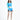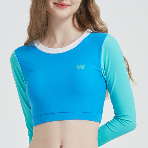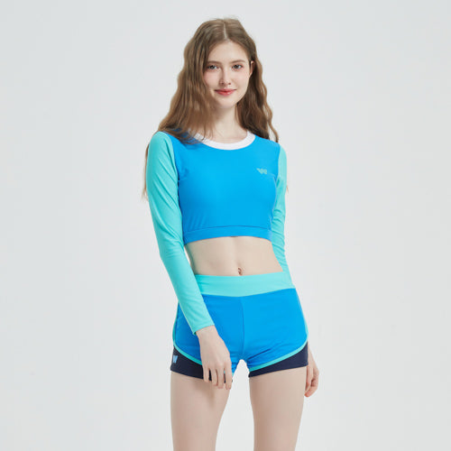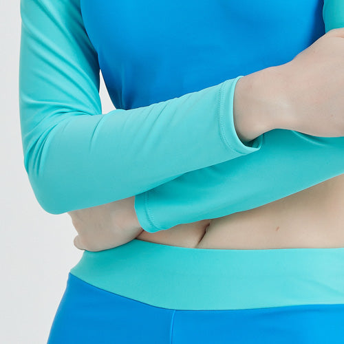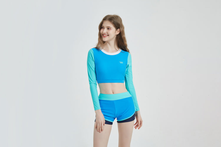 清新寶藍拼淺藍配色的露腰泳衣套裝,採用高彈力防曬面料,能完美襯托膚色。長袖設計搭配露腰剪裁,讓手臂得到充分防曬保護,同時展現腰身曲線。V型平腳褲設計不只修飾大腿線條,更方便活動自如,特別適合滑水、衝浪等水上運動時穿著。