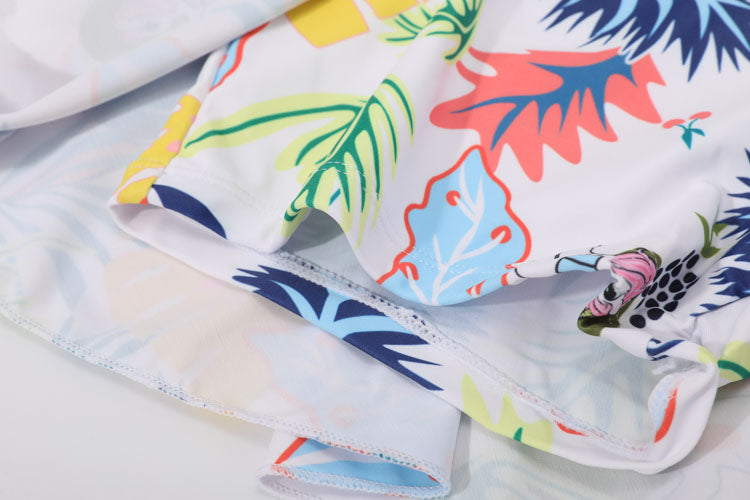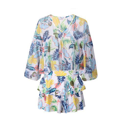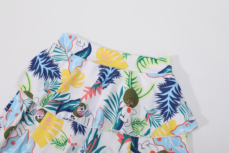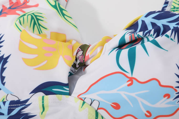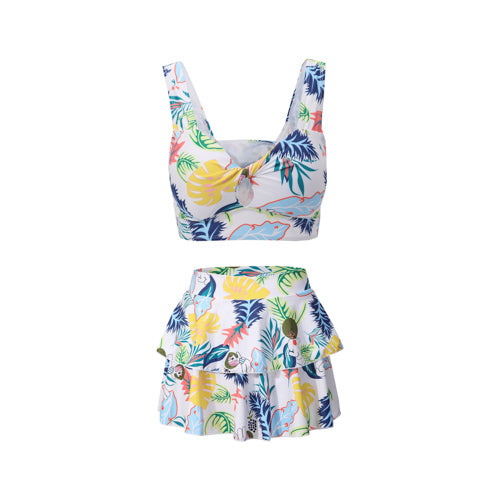 這款充滿熱帶風情的三件式泳裝,以清新的藍色系熱帶葉片印花為主調,搭配繽紛的花卉點綴,展現度假風情。上身採用V領設計的比堅尼款式,搭配蓬鬆可愛的裙擺平腳褲,完美修飾腿部線條。配套的雪紡防曬外套不僅能靈活調節溫度,更可作為時尚外搭,打造全方位的度假造型。特別適合想在沙灘、會所泳池或溫泉享受悠閒時光的女士,讓您在水中運動或沙灘漫步時都能展現優雅自信。