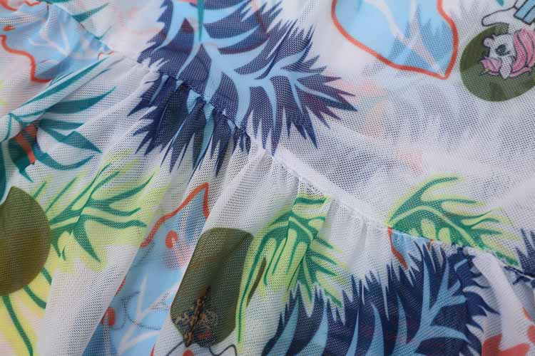採用清新藍色系熱帶印花圖案,搭配繽紛花卉元素,展現度假休閒風格,突顯個人品味。