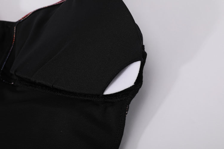 時尚黑色連身泳衣搭配紅色漸層條紋設計,展現動感活力。前胸V領採用獨特條紋點綴,營造層次感。特製的臀部包覆設計與人魚線立體剪裁,讓你在泳池中展現自信風采。
