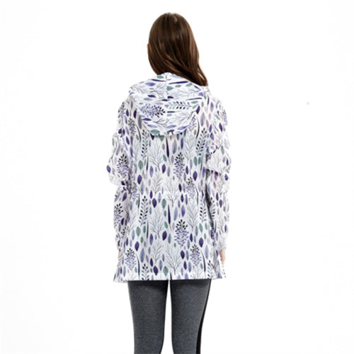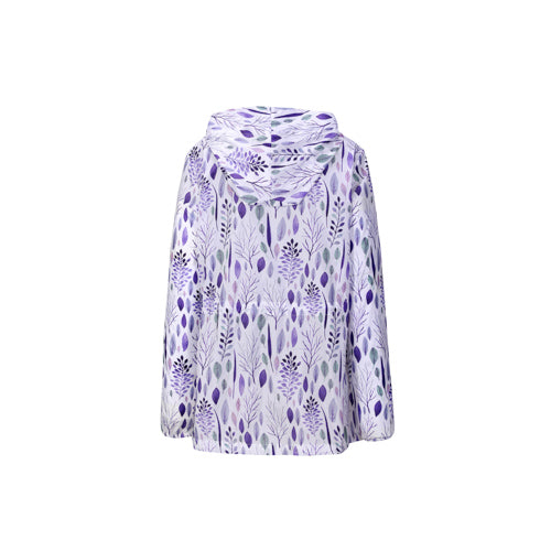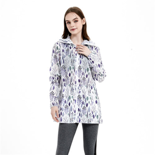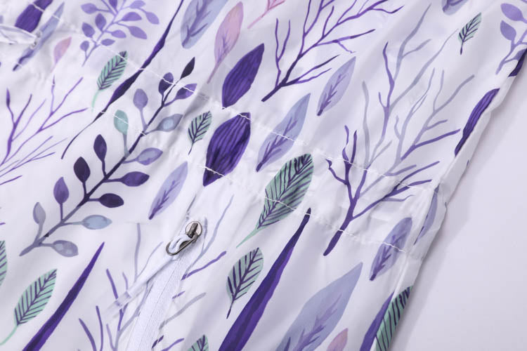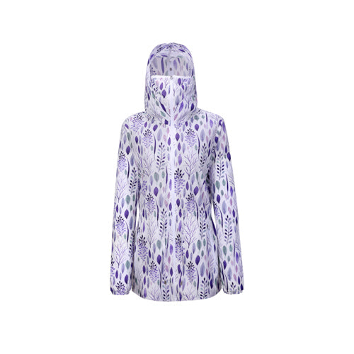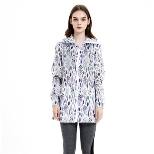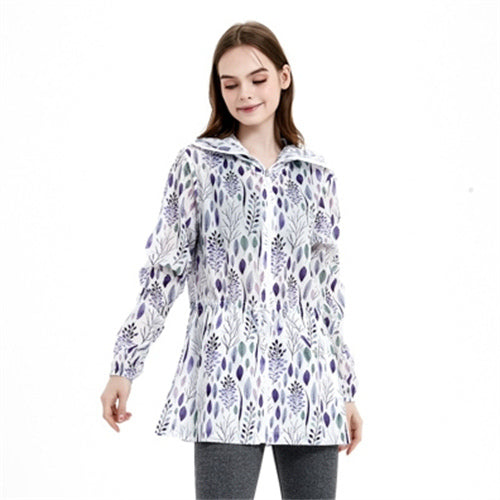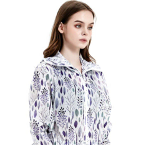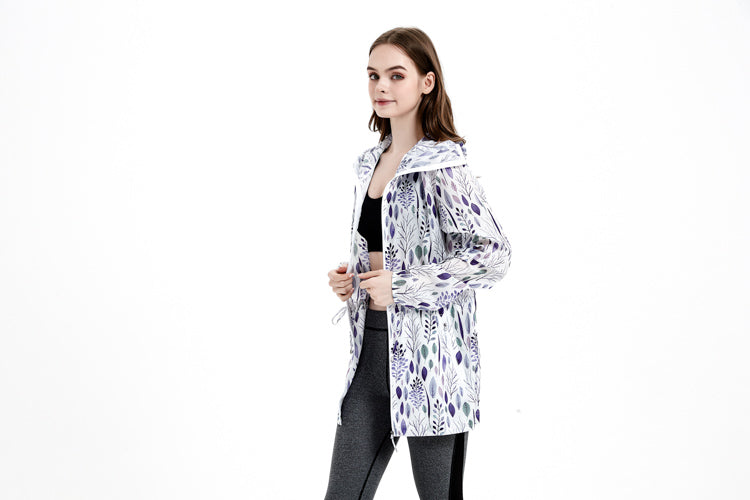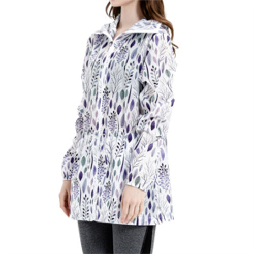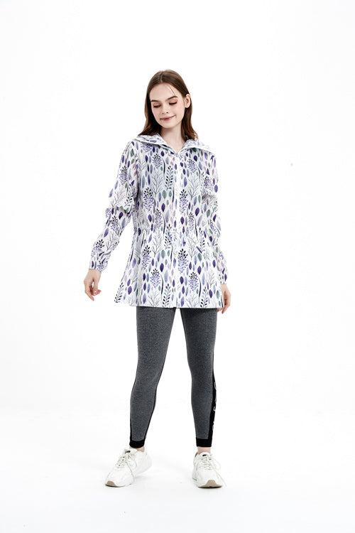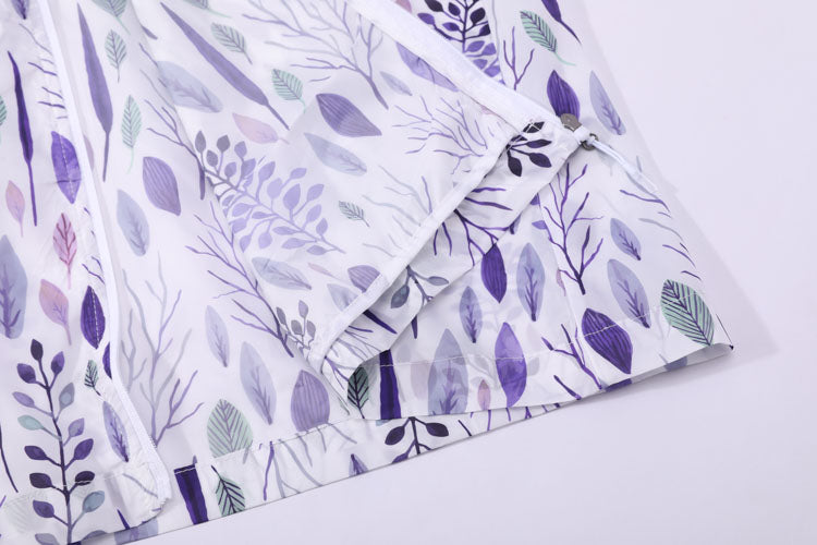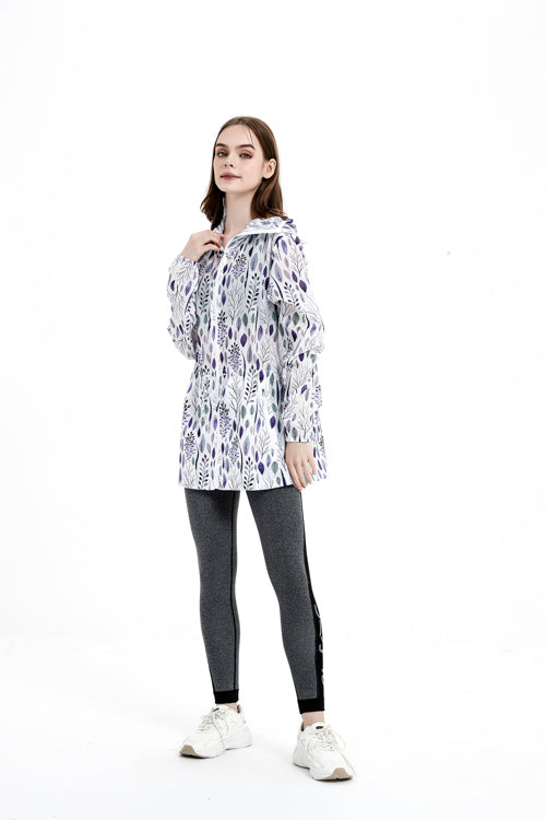 優雅紫色花卉印花,展現柔美春季風格。採用輕量防潑水面料,搭配可調式連帽設計,完美結合時尚與實用性。